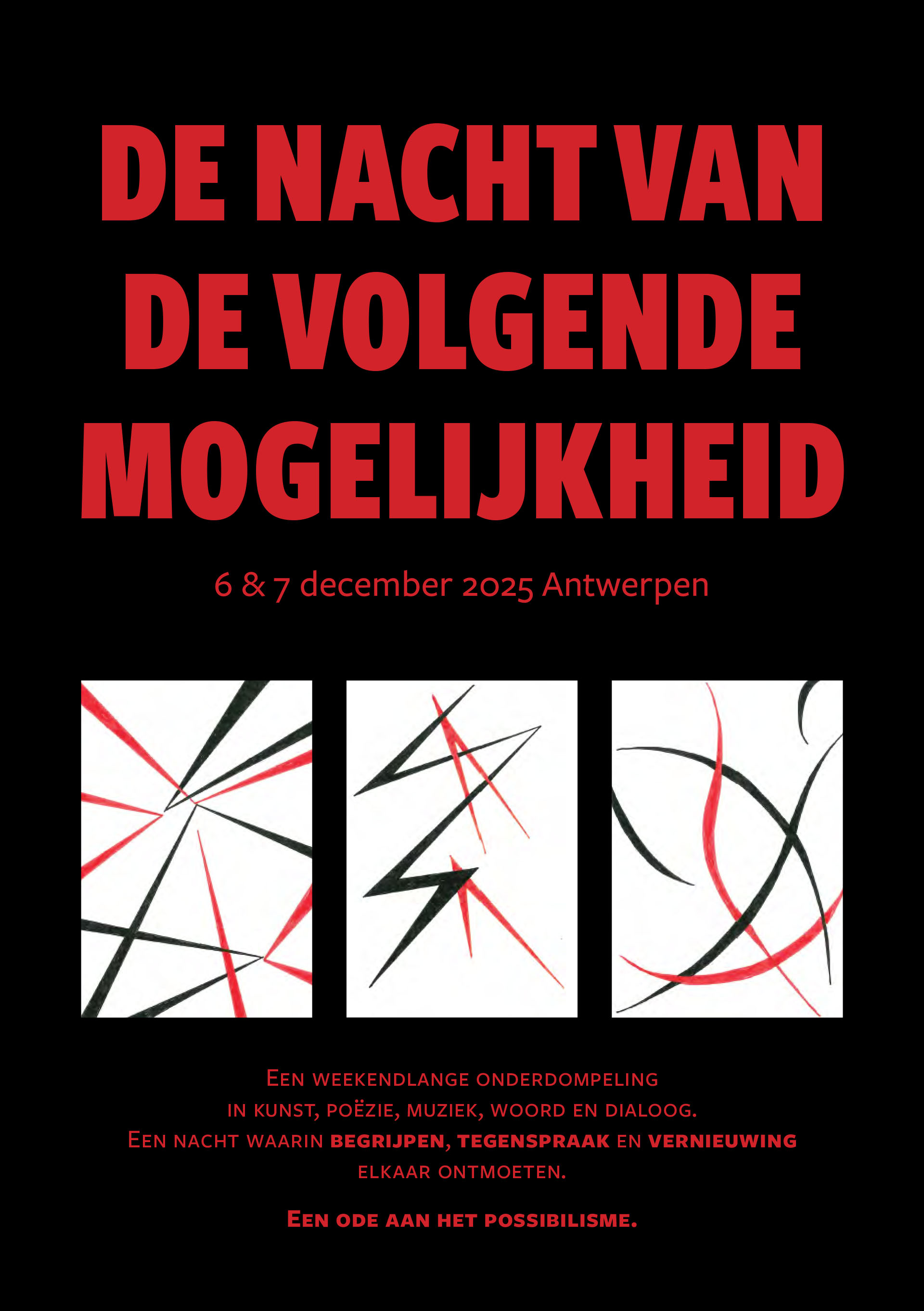 De Nacht van de Volgende Mogelijkheid brengt kunst, wetenschap, muziek, poëzie en filosofie opnieuw samen in één groot weekend van ontmoetingen. Een derde editie in de geest van Caroline Pauwels. Een uitnodiging om opnieuw te kijken, opnieuw te vragen, opnieuw te dromen.