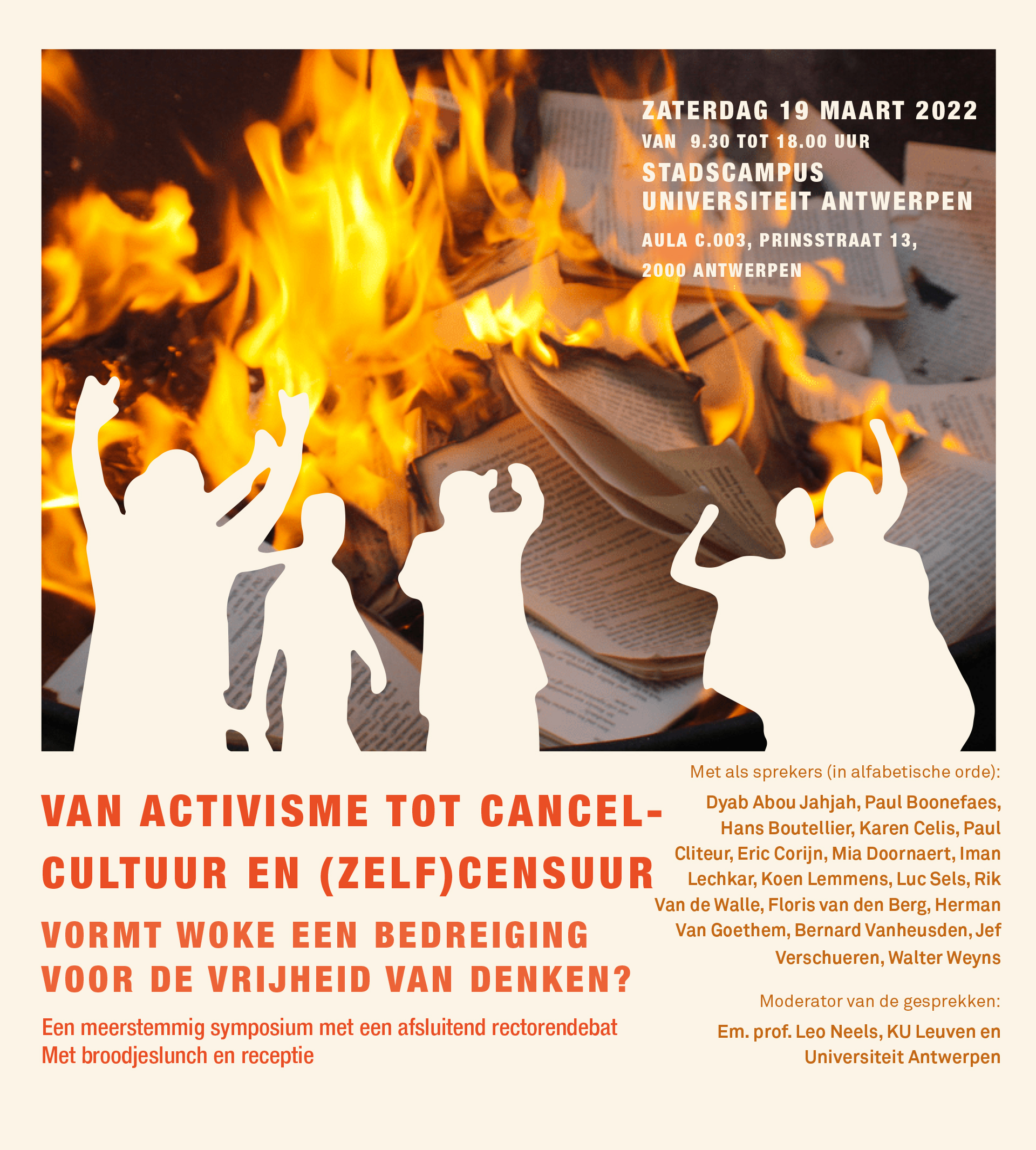 Toegang: € 15, vooraf te betalen op rekeningnummer BE98 0017 2195 3393 van het Humanistisch Verbond, met vermelding: Van activisme tot cancelcultuur, naam, aantal deelnemers. Prijs inclusief broodjeslunch en receptie. Studenten gratis. Inschrijven (verplicht) via deze link.