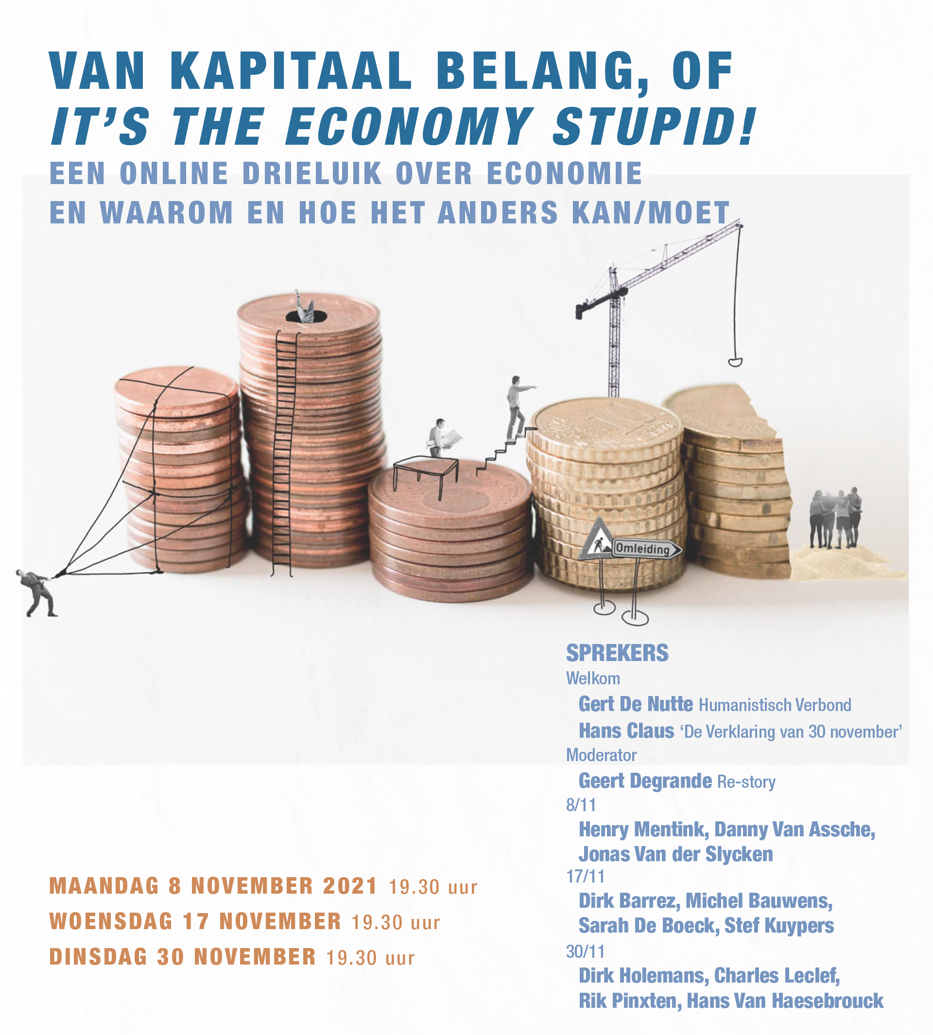 Een online drieluik over economie en waarom en hoe het anders kan/moet met op 8 november sprekers Henry Mentink, Danny Van Assche en Jonas Van der Slycken, en welkom door Gert De Nutte (Humanistisch Verbond) en Hans Claus ('De Verklaring van 30 november'). Geert Degrande (Re-story) is moderator.