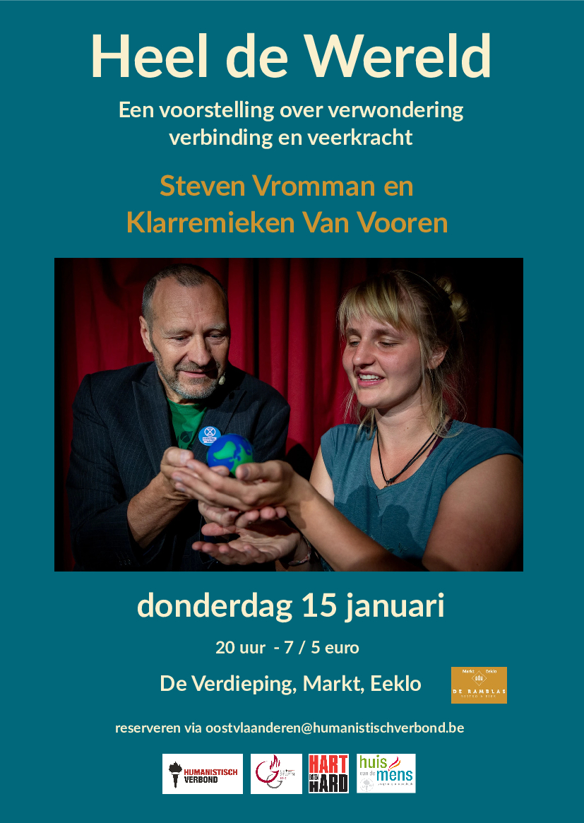 We bevinden ons midden in een planetaire noodsituatie. De vraag is hoe we moed en kracht kunnen verzamelen om met deze crisis om te gaan. In 'Heel de Wereld' gaan Klarremieken Van Vooren en Steven Vromman aan de slag met verwondering en boosheid, met dankbaarheid en actie. Deze voorstelling gaat over verbinding metde wereld, onszelf, de anderen, de nietmenselijke wezens en de toekomstige generaties. Via muziek, verhalen, humor en dialoog maken we verbinding met het web van het leven. Vandaaruit wordt misschien duidelijk hoe we samen onze beslissende verantwoordelijkheid kunnen opnemen. Met
