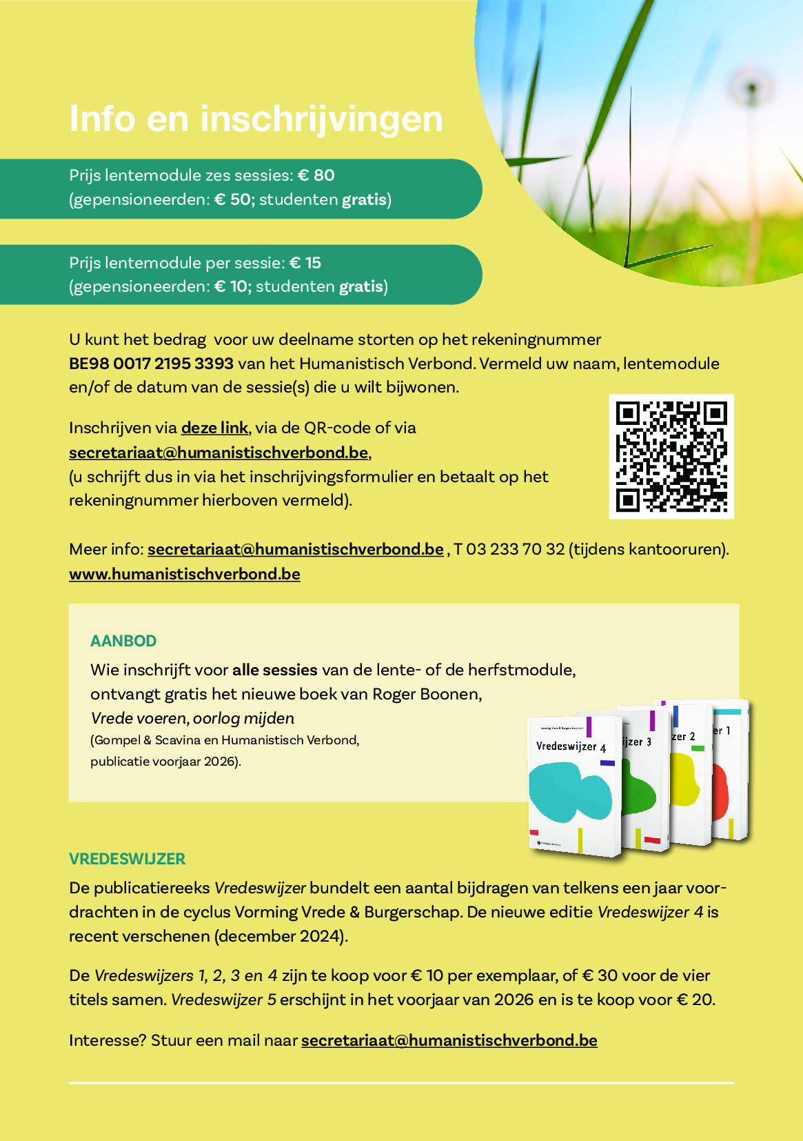 U kunt het bedrag voor uw deelname storten op het rekeningnummer BE98 0017 2195 3393 van het Humanistisch Verbond. Vermeld uw naam, lentemodule en/of de datum van de sessie(s) die u wilt bijwonen.