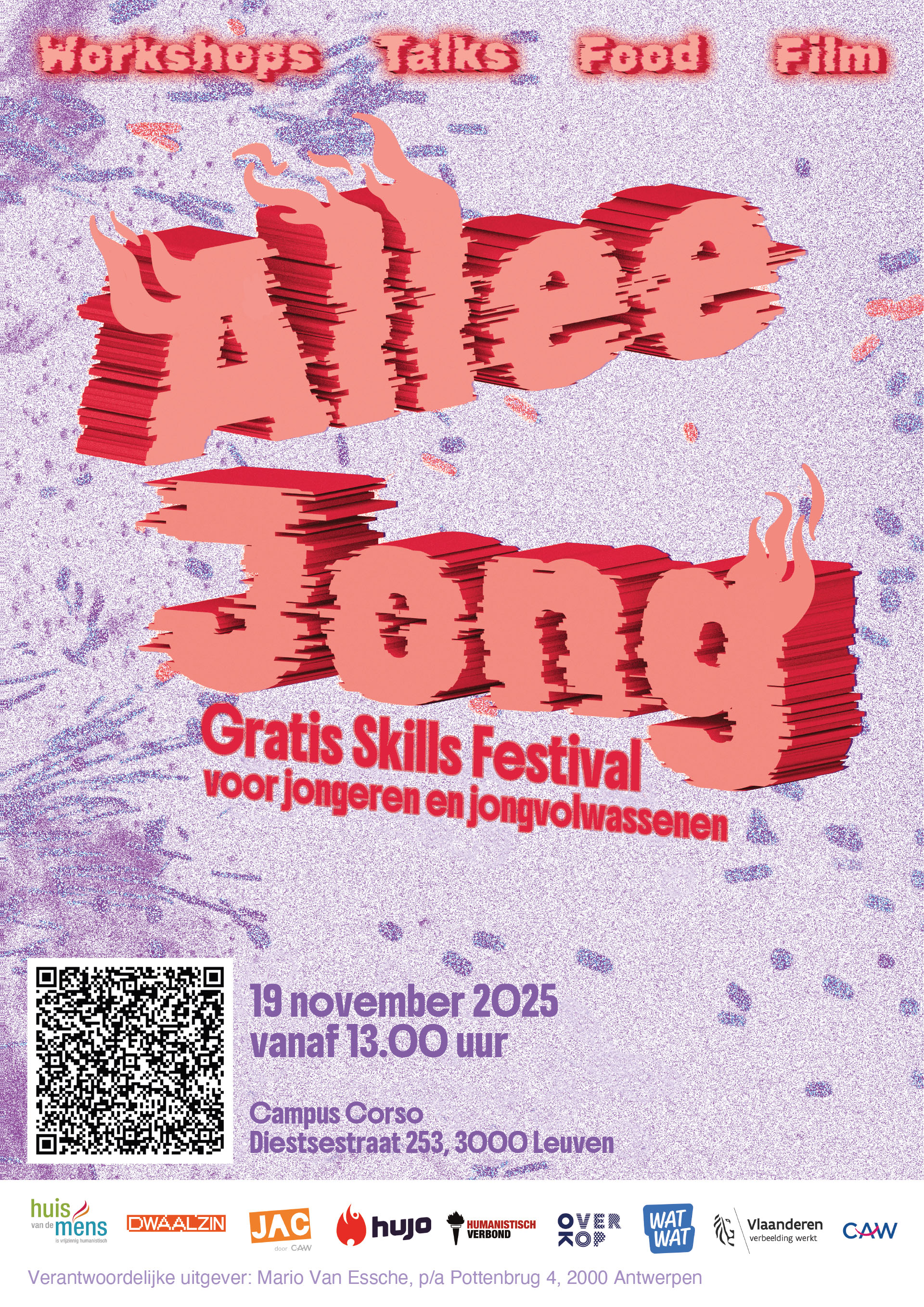 Onze humanistische familie nodigt je van harte uit op het allereerste Jongerenfestival 'Allee Jong', op 19 november in Campus Corso te Leuven. We kijken uit naar een creatieve en verbindende dag die de weg naar volwassenheid, hedendaagse survival skills en de kunst om jezelf te mogen zijn en worden in de spotlights zet.