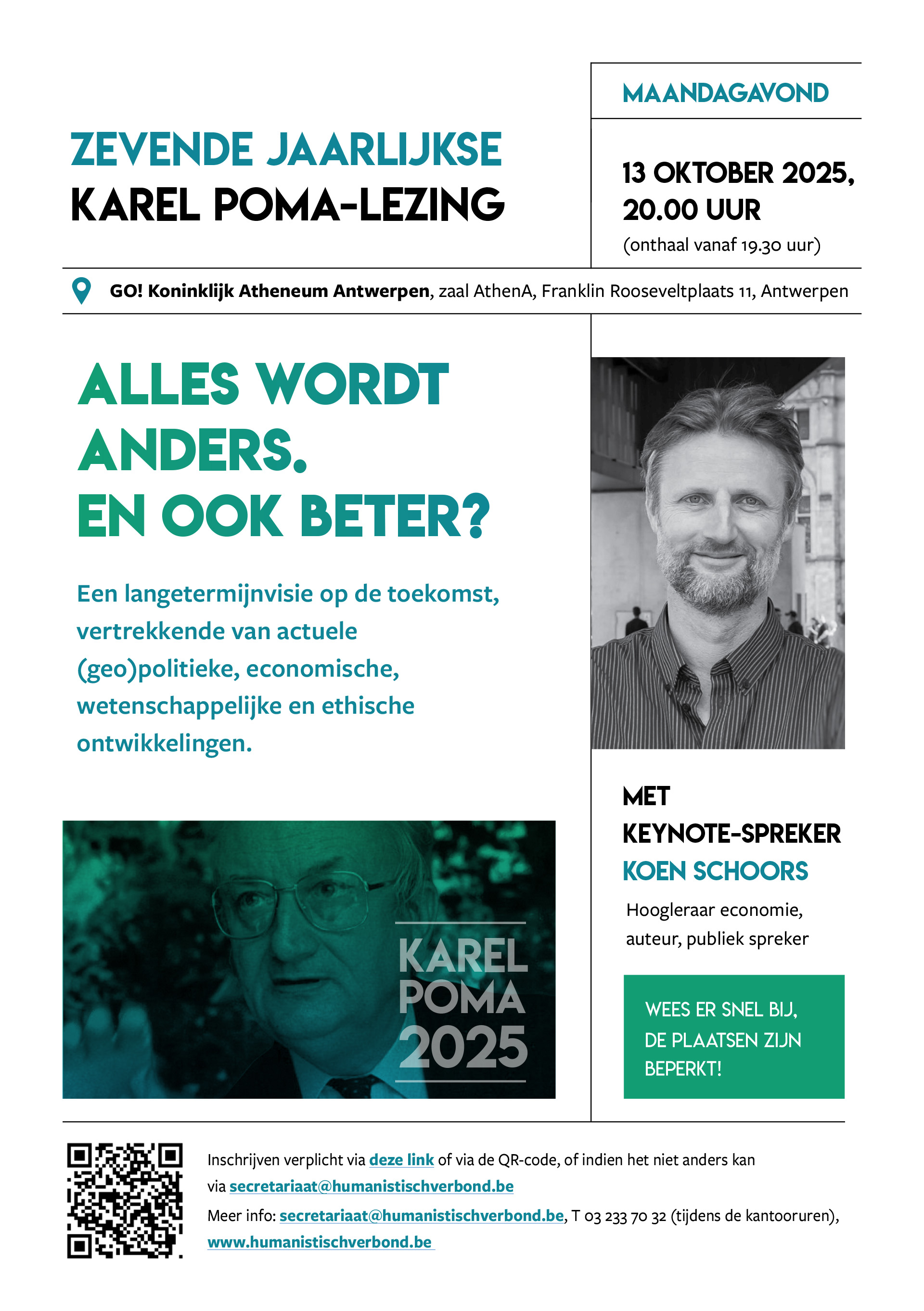 Op maandagavond 13 oktober 2025 vond in de goedgevulde AthenA-zaal van het GO! Koninklijk Atheneum Antwerpen de door het publiek bijzonder gesmaakte zevende editie plaats van de jaarlijkse Karel Poma-lezing, met prof. Koen Schoors (UGent) als centrale spreker.