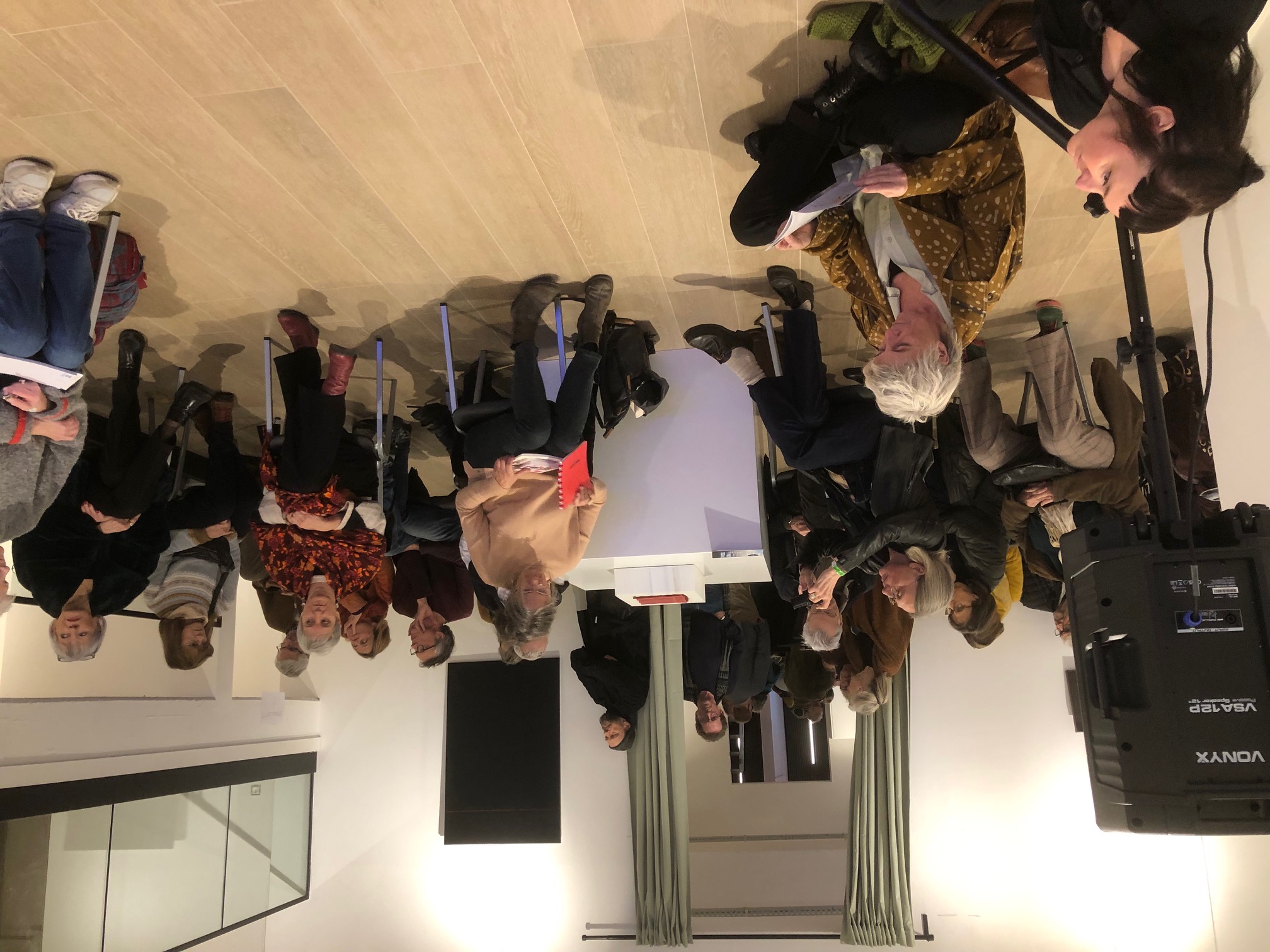 Op zondagnamiddag 30 november 2025 vond de finissage plaats van de allereerste tentoonstelling in de nieuwe ruimte van het Humanistisch Verbond. Ilse Kerkove cureerde een expo waarin achttien kunstenaars hun licht lieten schijnen op de zes krijtlijnen van de Verklaring van 30 november, een kort en krachtig richtinggevend ‘manifest’ over maatschappelijke transitie. Het werd een feestelijke namiddag, met toespraken door Hans Claus en Humanistisch Verbond-coördinator Gert De Nutte, en een inspirerende lezing door prof. Paul Verhaeghe, hoogleraar klinische psychologie en psychoanalyse aan de UGent.