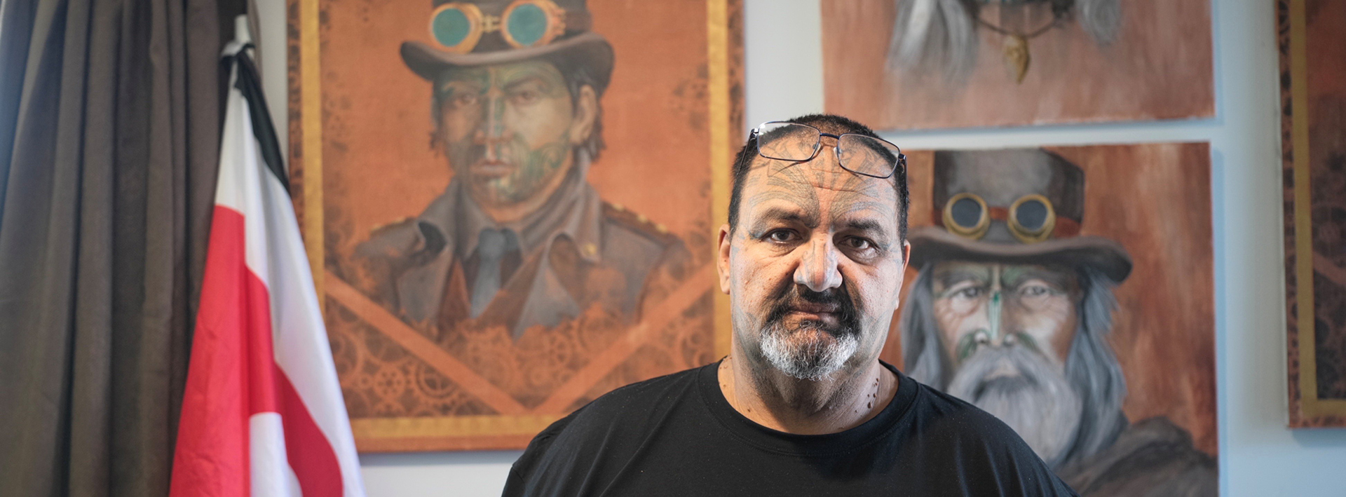Eru Hiko-Tahuri ontving ons niet, hij begroette ons. Meteen stelde hij ons voor aan zijn twee zonen. Warm, vanzelfsprekend, zonder theater. Familie eerst. Geen slogan, maar praktijk. In de woonkamer hingen zijn schilderijen. Vogels als kākāpō, hoiho, huia en rowi uit Nieuw-Zeeland – herkenbaar en toch niet illustratief – en portretten, met die merkwaardige spanning tussen nabijheid en stilering. In mijn portretfoto van hem staat hij hier niet voor wat decoratief werk, maar voor een geschilderde wereld die terugkijkt. De figuren achter hem lijken voorouders, dubbelgangers of wachters: niet folkloristisch, wel geladen. Met hun hoeden en brillen verbinden ze traditie aan ironie, geheugen aan verbeelding. Zo wordt de achtergrond hier geen decor, maar een tweede stem. Alsof dit portret wil zeggen: een mens komt nooit alleen in beeld. Ik wist meteen: dit is iemand die niet alleen denkt en spreekt, maar ook kijkt. En wie kijkt, schildert anders. Ik vertrouw al een leven lang op dat trage, kunsthistorische instinct dat zegt dat een huis waar portretten hangen bijna altijd een huis is dat gelooft in mensen. Niet in abstracties, niet in slogans, maar in gezichten.