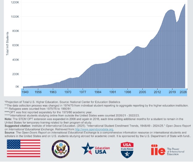 De laatste decennia nam het aantal internationale studenten aan de Amerikaanse universiteiten exponentieel toe. In het academiejaar 1980-81 bedroeg het aantal buitenlanders 311.882 studenten, zijnde 2,6 percent van de totale studentenpopulatie. In het academiejaar 2024-2025 was dit opgelopen tot 1.177.766 eenheden, zijnde 6,1 percent van de inschrijvingen.